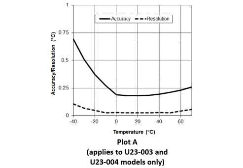 準確性 U23-001A 和 U23-002A:±0.25°C 從 -40 到 0°C(±0.45 從 -40 到 32°F),±0.2°C 從 0 到 70°C(±0.36 從 32 到 158°F )